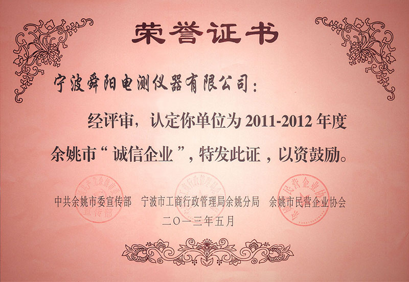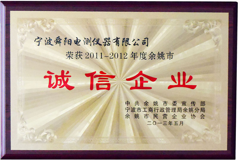 2013年5月,被中共余姚市委宣傳部、寧波市工商行政管理局余姚分局、余姚市民營企業(yè)協(xié)會(huì)聯(lián)合評(píng)定為2011-2012年度余姚市“誠信企業(yè)”